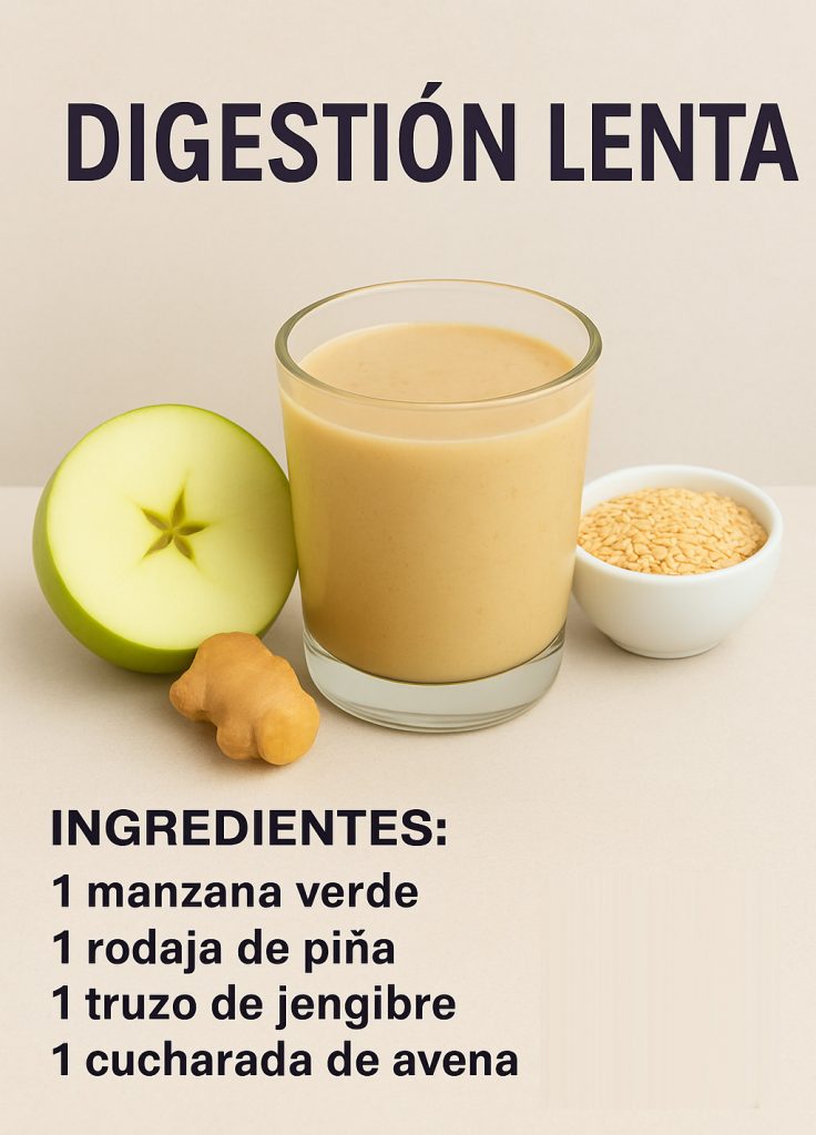 🍏 ¿Sientes esa pesadez traicionera después de comer, ese vientre hinchado como un globo que te roba la comodidad, la digestión lenta que convierte cada bocado en una carga y la inflamación abdominal que te hace evitar espejos y ropa ajustada? Imagina por un instante un batido cremoso, verde como esmeralda y picante como fuego, hecho con manzana verde que atrapa toxinas, piña que disuelve con bromelina, jengibre que enciende enzimas y avena que fibra como un barrendero interno –licuado en una taza de agua o vegetal para un elixir que activa tránsito intestinal como un río desbordado, reduce hinchazón en horas y te regala un vientre plano, digestión fluida y energía que dura todo el día. Este batido no es un jugo común lleno de azúcares que empeoran; es un ritual natural que desbloquea intestinos perezosos, calma inflamación y te libera de la cárcel de la pesadez post-comida. ¿Sientes esa urgencia en tu abdomen, ese anhelo por comidas sin remordimientos, un vientre ligero y una vitalidad que fluye sin pausas? Sigue leyendo, porque este batido –tomado 30 min antes de comidas principales o en ayunas, 3 veces por semana– no solo digiere: te transforma, te desinflama y te hace sentir invencible ante la hinchazón. Prepárate para un viaje que te mantendrá hipnotizado, sorbo a sorbo, hasta que sientas el cambio en tu vientre –pesadez evaporada, tránsito fluido, energía inagotable. ¡Tu revolución digestiva comienza ahora!