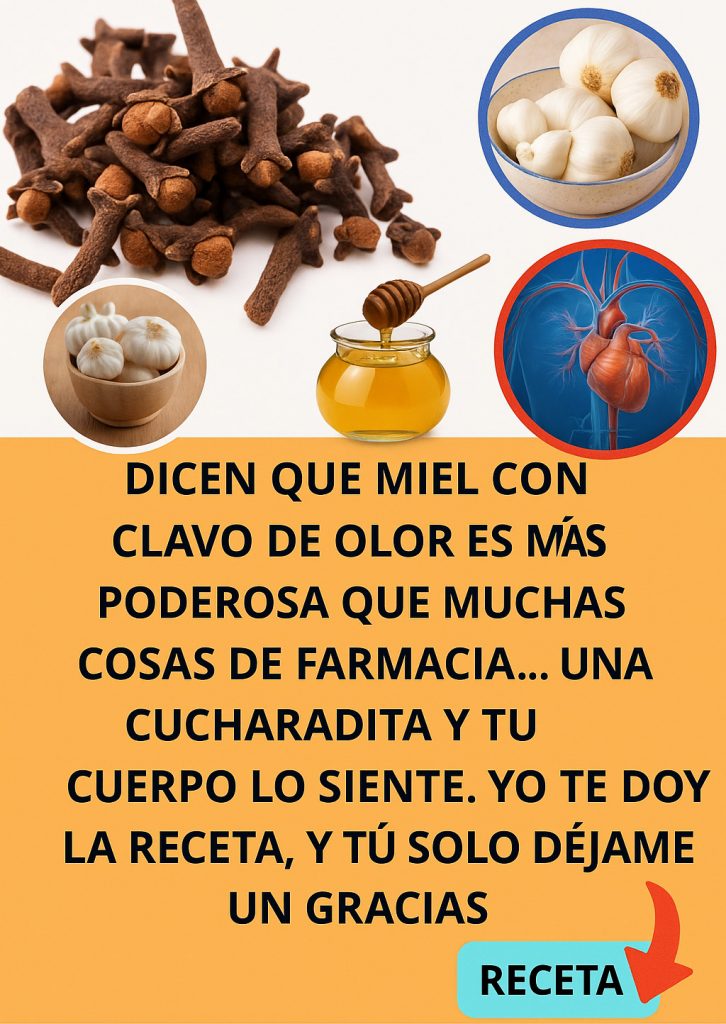🍯 ¿Sientes esa tos que raspa tu garganta como arena, digestión pesada que hincha tu vientre como un globo traicionero, o un sistema inmune débil que te deja vulnerable a cada virus que acecha en el aire, robándote energía y días preciosos? Imagina por un instante un elixir dorado, aromático como un bosque especiado y potente como un escudo divino, hecho con miel que antibacteriza con dulzor curativo, clavo de olor que desinflama como fuego analgésico y ajo que aniquila patógenos con alicina feroz –mezclados en una pasta que fortalece corazón, regula azúcar y rejuvenece tu cuerpo entero con antioxidantes que barren toxinas como un viento purificador. Este remedio no es un jarabe comercial lleno de químicos que enmascaran; es el trío ancestral que tus abuelos masticaban en silencio para combatir resfriados, calmar dolores y mantener un cuerpo fuerte como roble. ¿Sientes esa urgencia en tu pecho, ese anhelo por una cucharadita diaria que te libere de infecciones, inflamación y fatiga, regalándote una vitalidad que fluye sin pausas? Sigue leyendo, porque esta preparación –una cucharadita al día, sola o en infusiones– no solo cura: te resucita, te blinda y te hace invencible ante el caos diario. Prepárate para un viaje que te mantendrá hipnotizado, cucharada a cucharada, hasta que sientas el cambio en tu aliento, tu energía y tu fuerza –inmunidad férrea, digestión fluida, corazón latiendo libre. ¡Tu revolución natural comienza ahora!