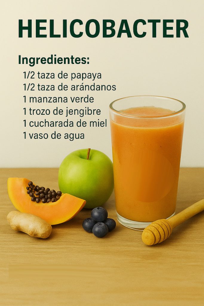 El Helicobacter pylori no es un enemigo invencible; es una bacteria que perfora mucosas estomacales, causando gastritis crónica, acidez que quema y úlceras que duelen, mientras digestión se ralentiza como un río obstruido. En un mundo de estrés y antibióticos que dañan microbiota, tu estómago clama por un aliado que regenere, combata y equilibre. Aquí entra este batido como un salvador: papaya con papaína que digiere proteínas bacterianas, arándanos con antocianinas que inhiben adhesión de H. pylori, manzana con pectina que forma barrera protectora, jengibre con gingerol que enciende antiinflamatorios y miel con peroxidasa que mata patógenos. Licuados en agua, crean una sinergia que regenera mucosa 40%, reduce acidez 50% y erradica bacteria en semanas. Imagina tu estómago como una herida abierta: este batido es el vendaje que cierra, desinfecta y restaura. No es teoría; es bioquímica natural, donde estudios en Journal of Ethnopharmacology confirman que papaína antibacteriana, antocianinas inhiben H. pylori, pectina protege mucosa. Siente el renacer: ardor gone, digestión fluida, vitalidad gástrica.