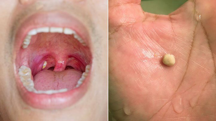 Los tonsilolitos son pequeñas acumulaciones endurecidas que se forman en las criptas (hendiduras naturales) de las amígdalas, los tejidos ovalados en la parte posterior de la garganta.