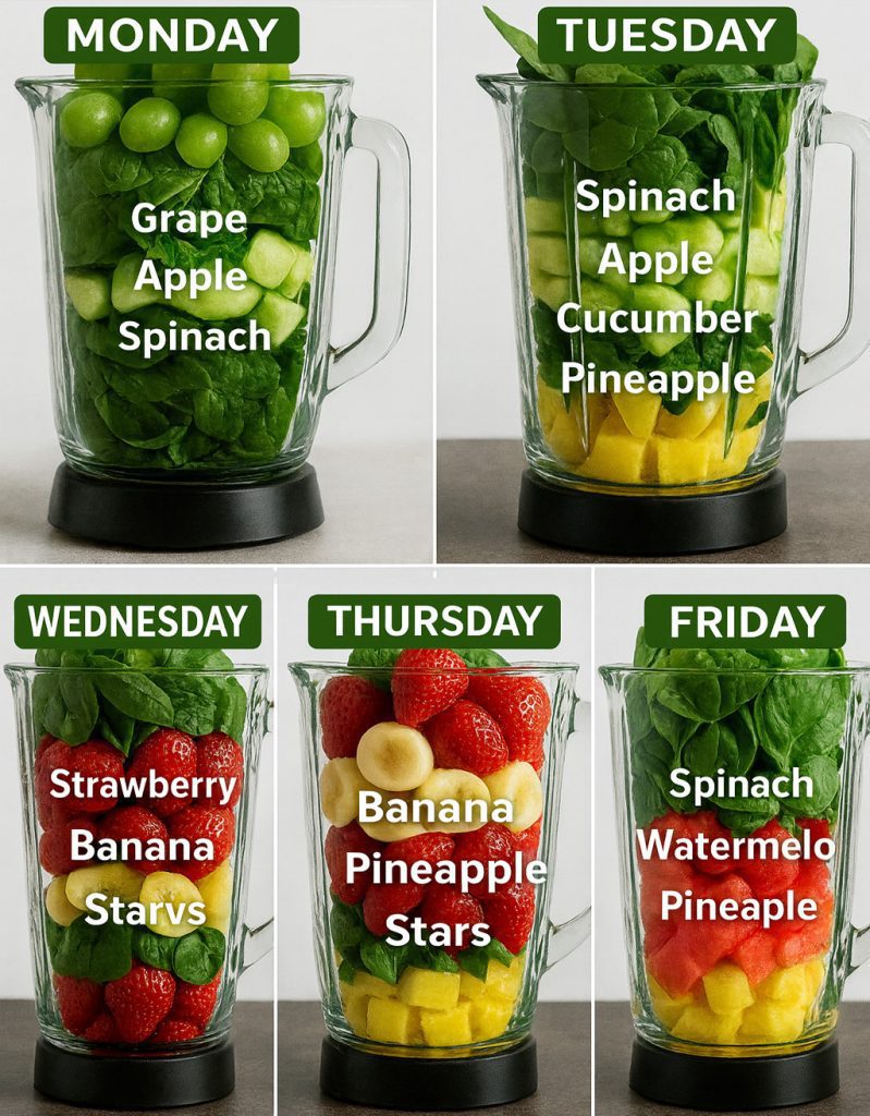 | Day 1 | The Green Radiance Detox | 1 cup Spinach, 1/2 Banana, 1/2 Green Apple, 1 tbsp Chia Seeds, 1 cup Water or Coconut Water. | Detox & Hydration ($\text{Vitamin A, Fiber}$) |